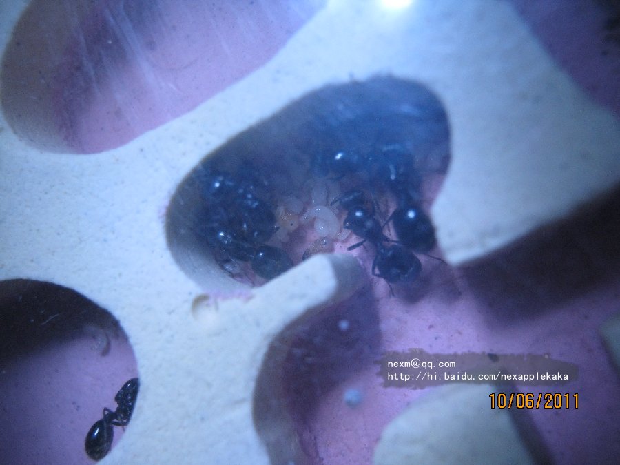 左边蚁室里的是新生工蚁,右侧蚁道壁上的是被捉来做苦力的工蚁,大小相差可见一斑了吧~~