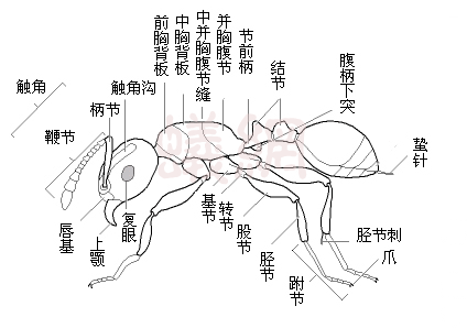 昆虫的身体一般分为头、胸、腹三部分,但是蚂蚁和一般昆虫有所区别。蚂蚁的腹部衍生出了三个部分:并胸腹、结节(腹柄节)和后腹部。因此,蚂蚁的身体也可以分为四个部分:头、并腹胸、腹柄和柄后腹(后腹部)。其中并腹胸的后部被称为并胸腹节,是腹部的第一节。