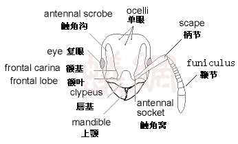 唇基以及额部的特征是分类的重要参考依据,此外,单眼(ocelli)、复眼的情况,唇基窝、触角窝的状况以及触角窝的特征都是头部的重要分类特征。
