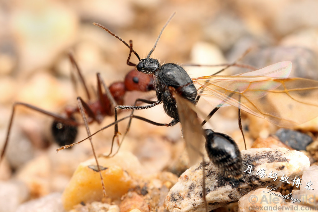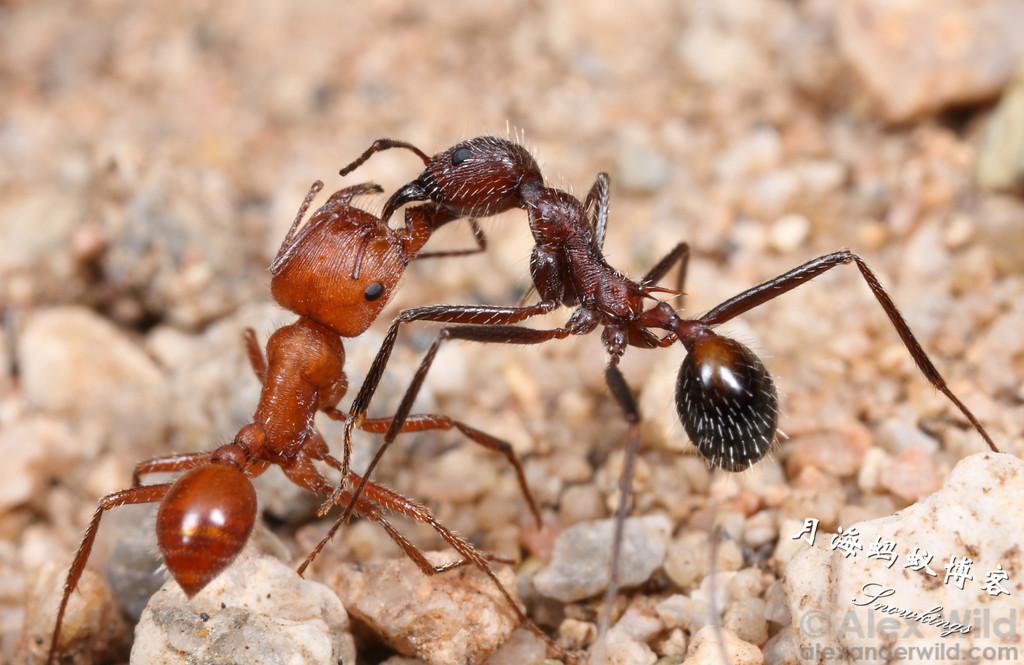 图为白毛新收获蚁的工蚁单挑马里科帕须蚁(Pogonomyrmex maricopa):