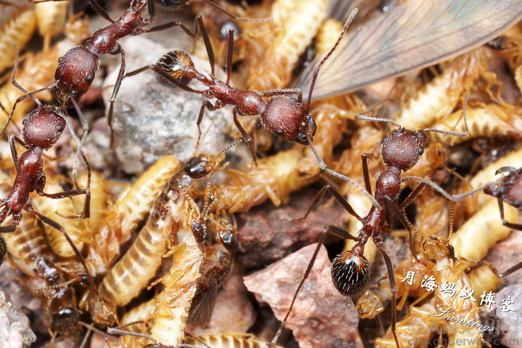 图为白毛新收获蚁猎食婚飞中的白蚁: